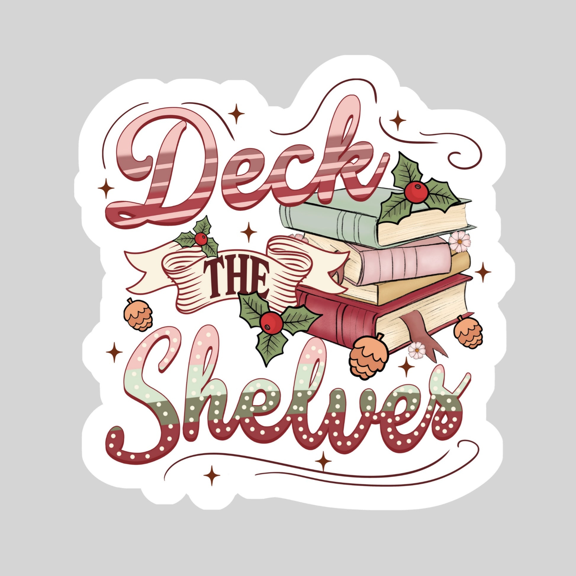 Deck the Shelves Christmas Sticker โ 3" Waterproof Bookish Sticker with Holo Overlay โ Reading, Books, Reader Gift, Book Lover