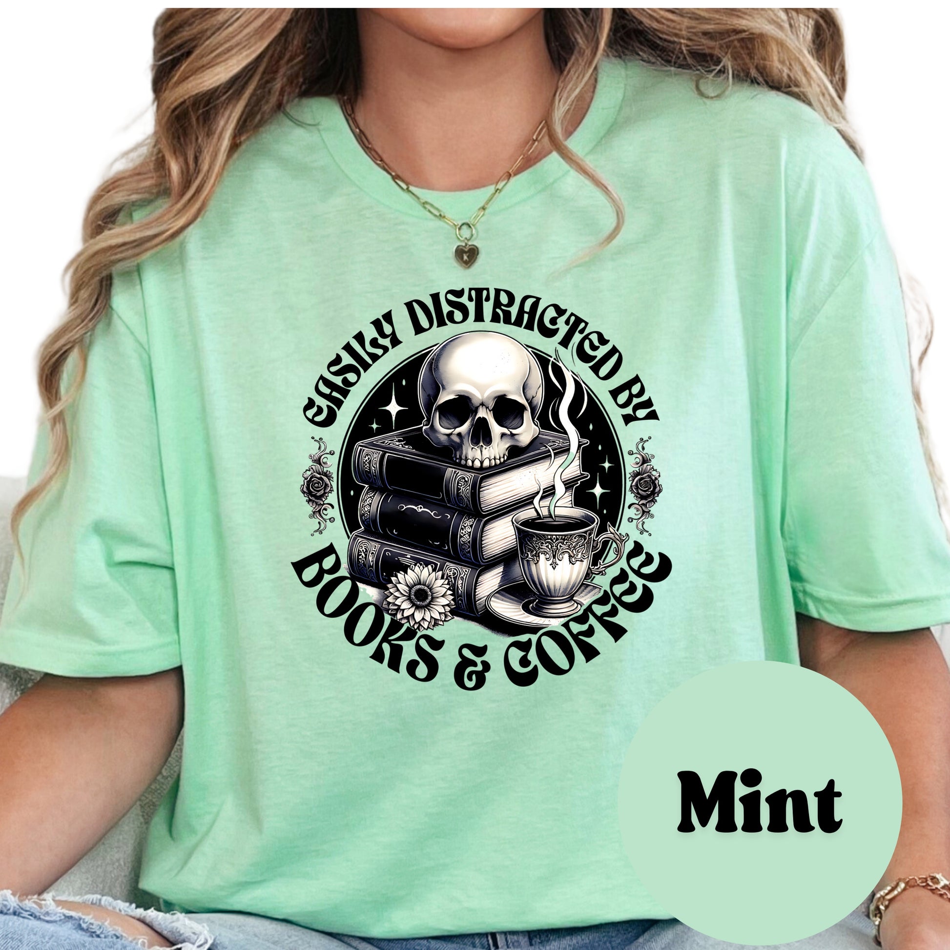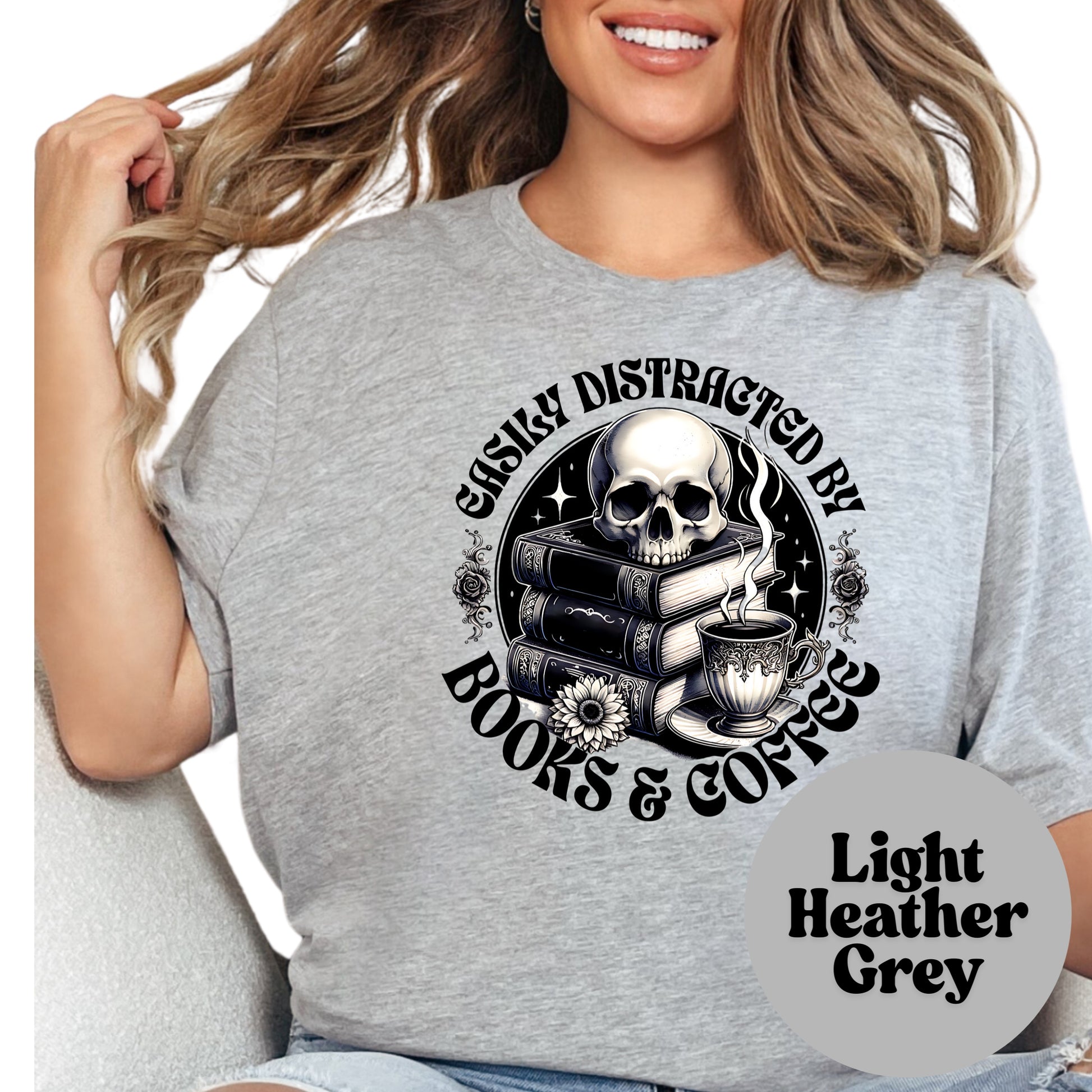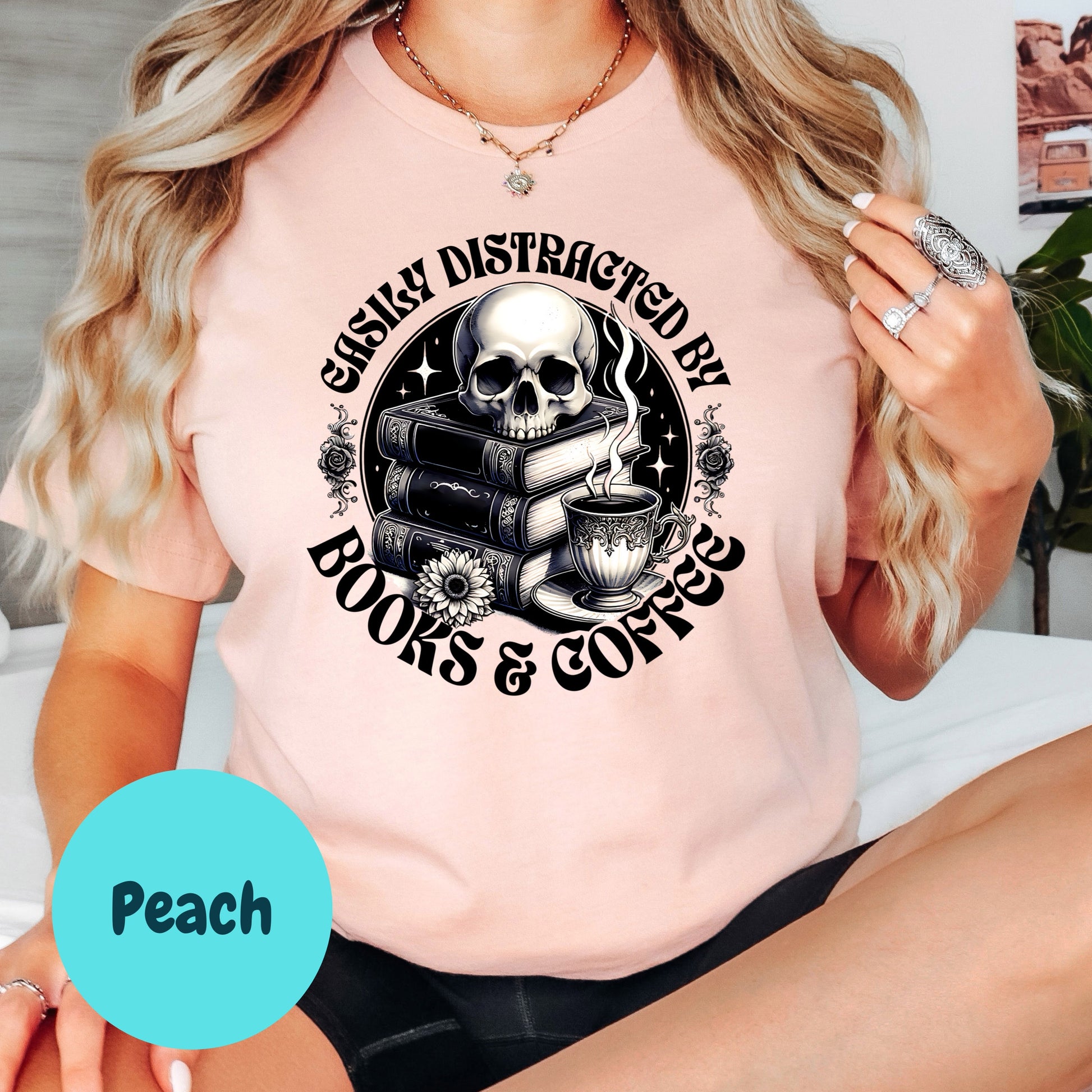 Easily Distracted by Books & Coffee Shirt – Gothic Book Lover Tee – Skull and Coffee Bookish Shirt – Cozy Spooky Reader Gift – Dark Academia Tee