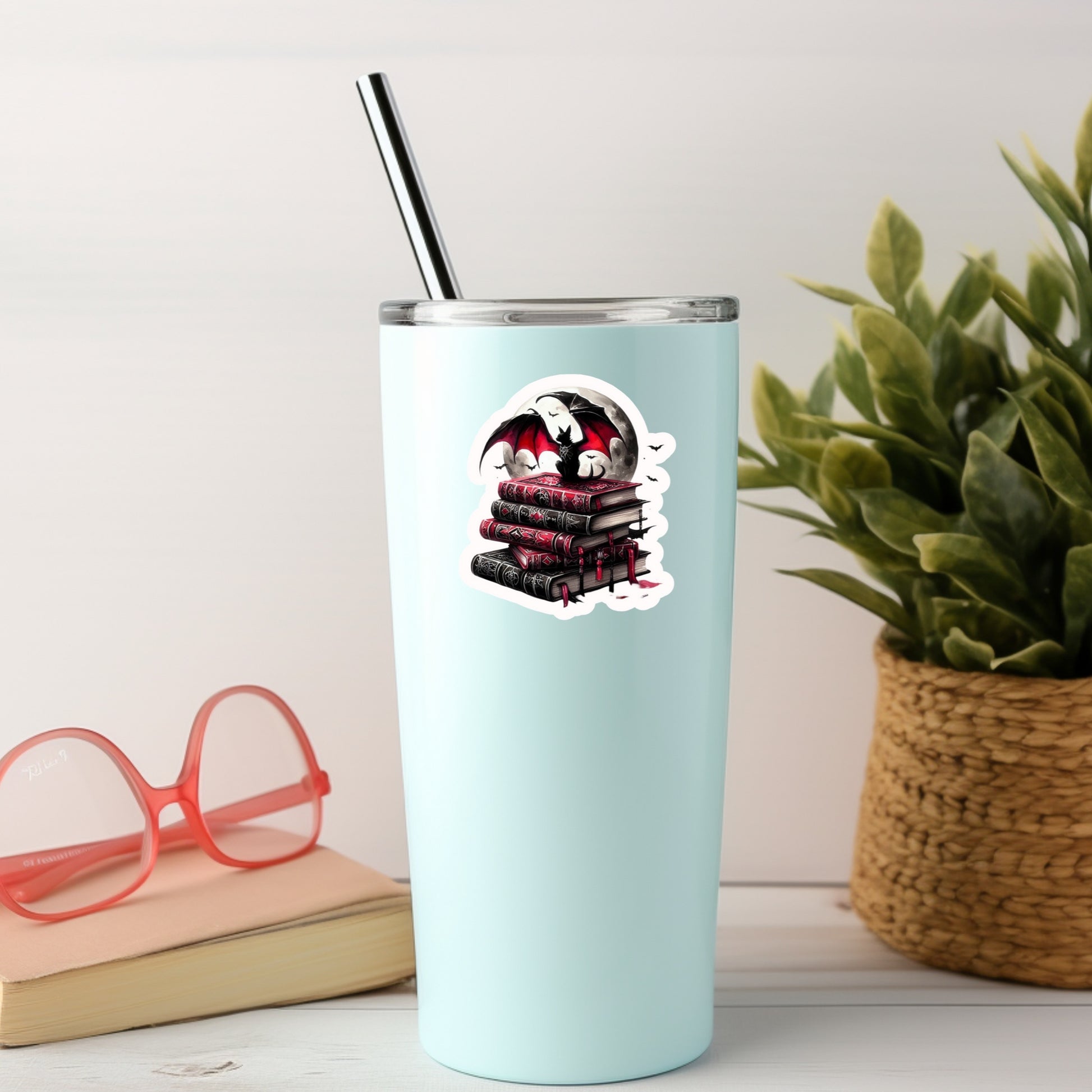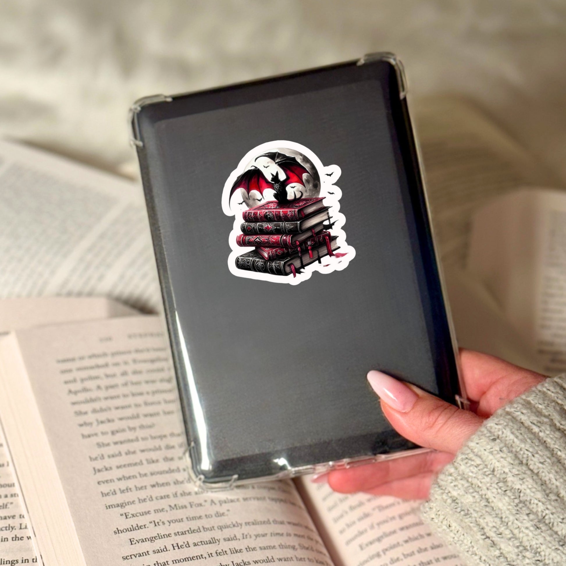 Gothic Dark Romance Bat on Books โ 3" Waterproof Bookish Sticker with Holo Overlay โ Reading, Books, Reader Gift, Book Lover