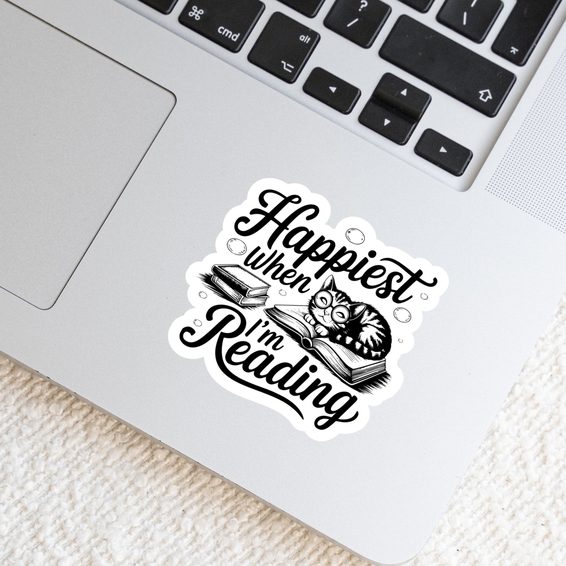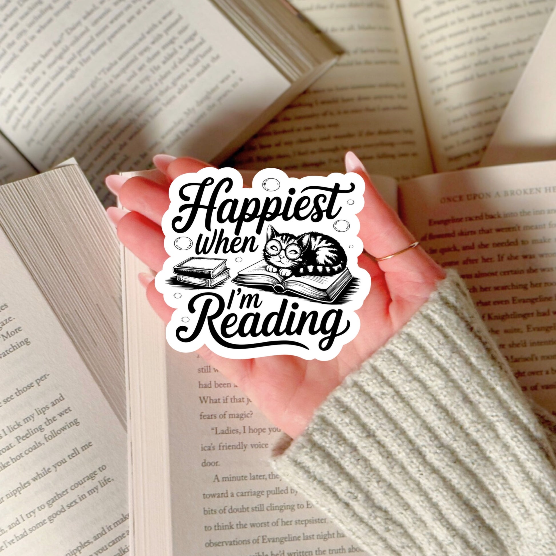 Happiest When I'm Reading With Cat โ 3" Waterproof Bookish Sticker with Holo Overlay โ Reading, Books, Reader Gift, Book Lover