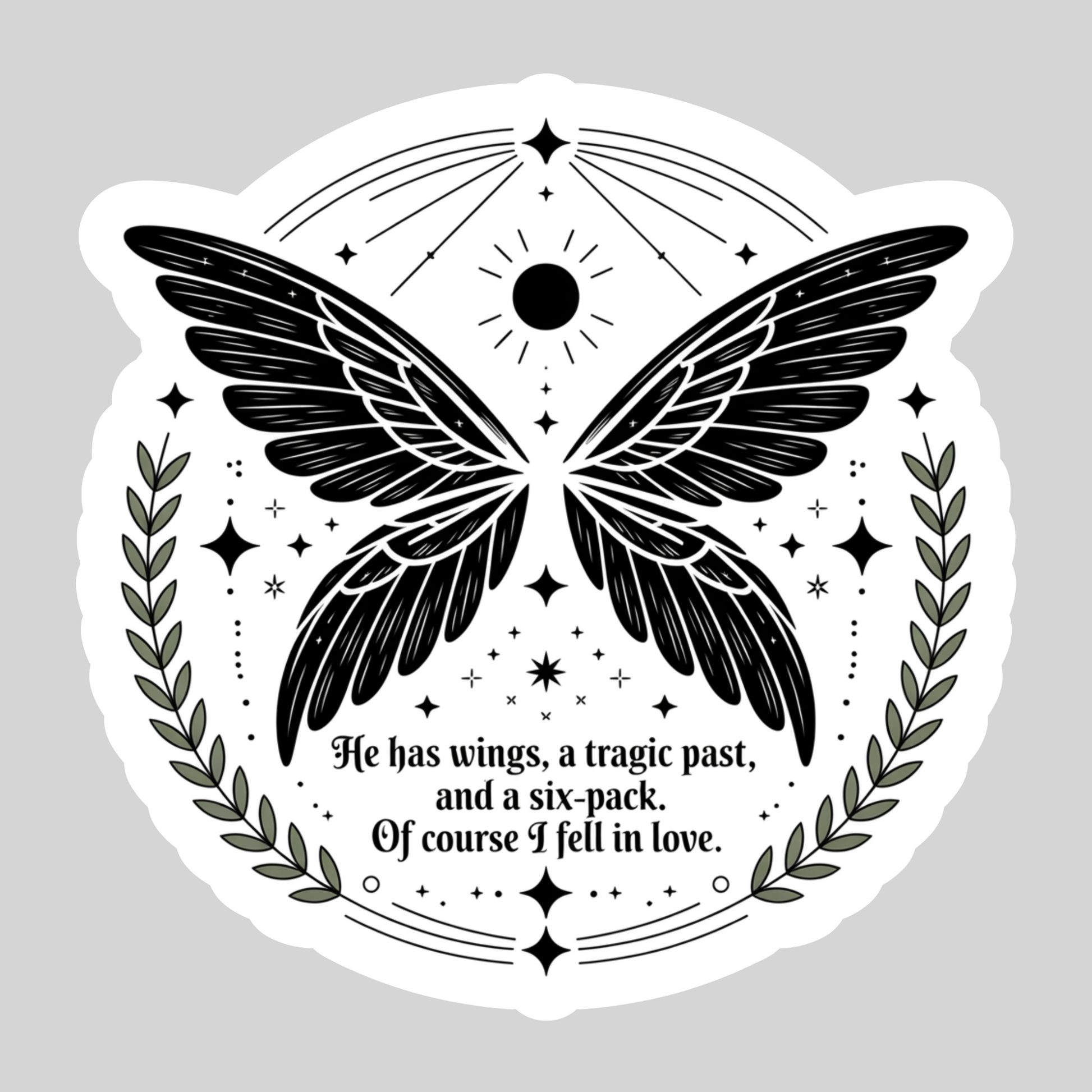 He has Wings a Tragic Past and a Six Pack; of Course I fell in Love – 3" Waterproof Bookish Sticker with Holo Overlay – Reading, Books, Reader Gift, Book Lover