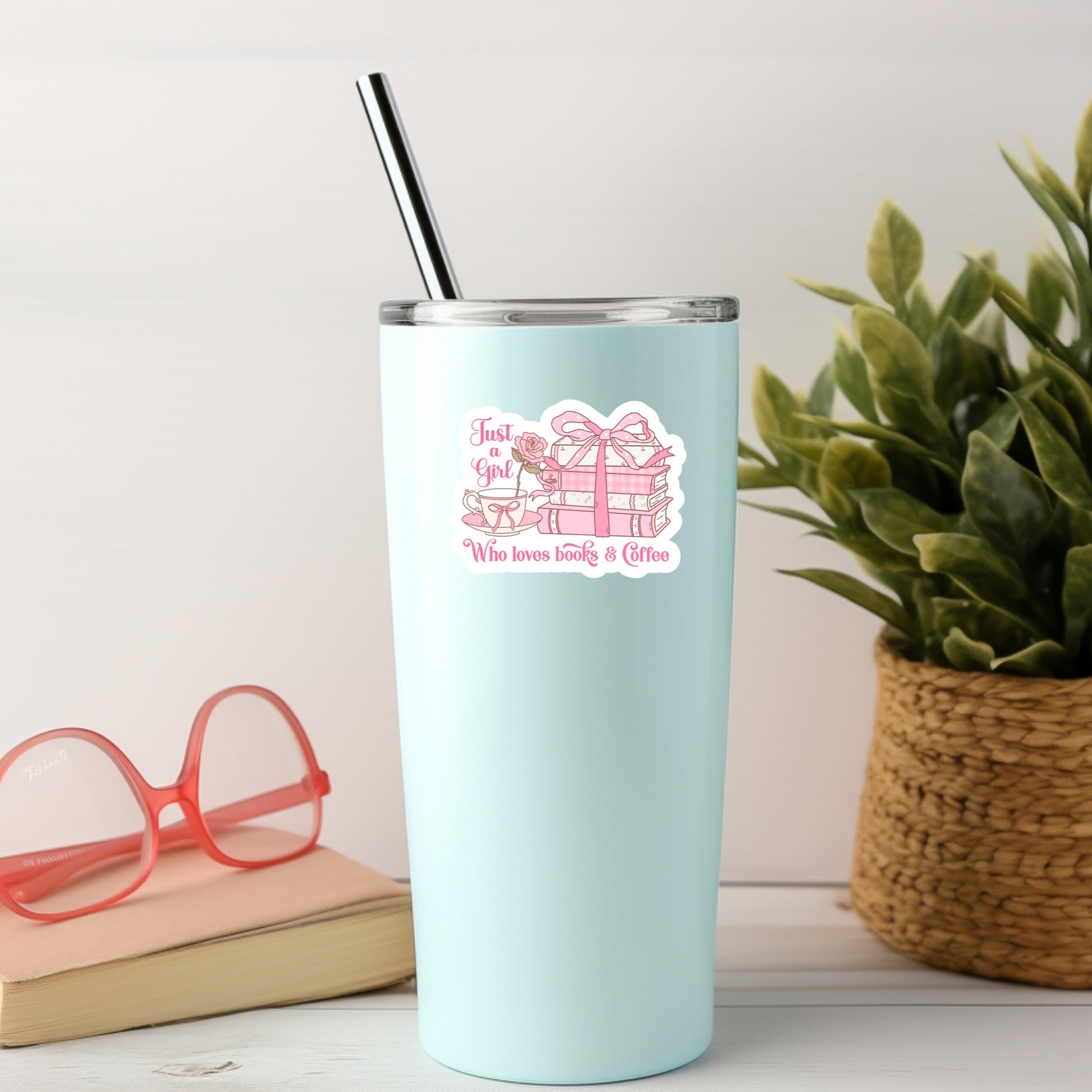 Just a Girl Who Loves Books and Coffee Pink Girlie Bow Coquette Book Reader Sticker โ 3" Waterproof Bookish Sticker with Holo Overlay โ Reading, Books, Reader Gift, Book Lover, Bookstore Merch