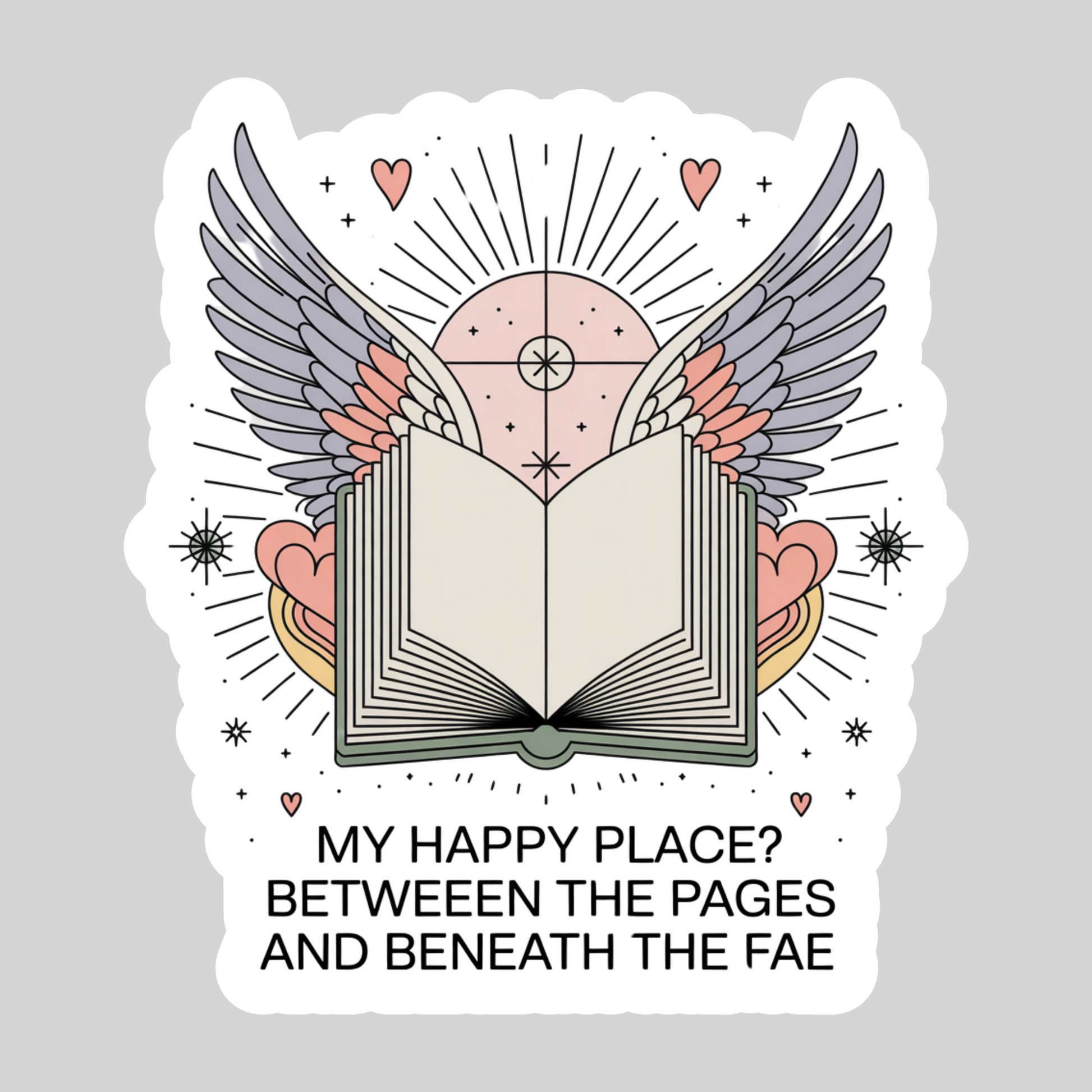 My Happy Place? Between the Pages and Beneath the Fey – 3" Waterproof Bookish Sticker with Holo Overlay – Reading, Books, Reader Gift, Book Lover