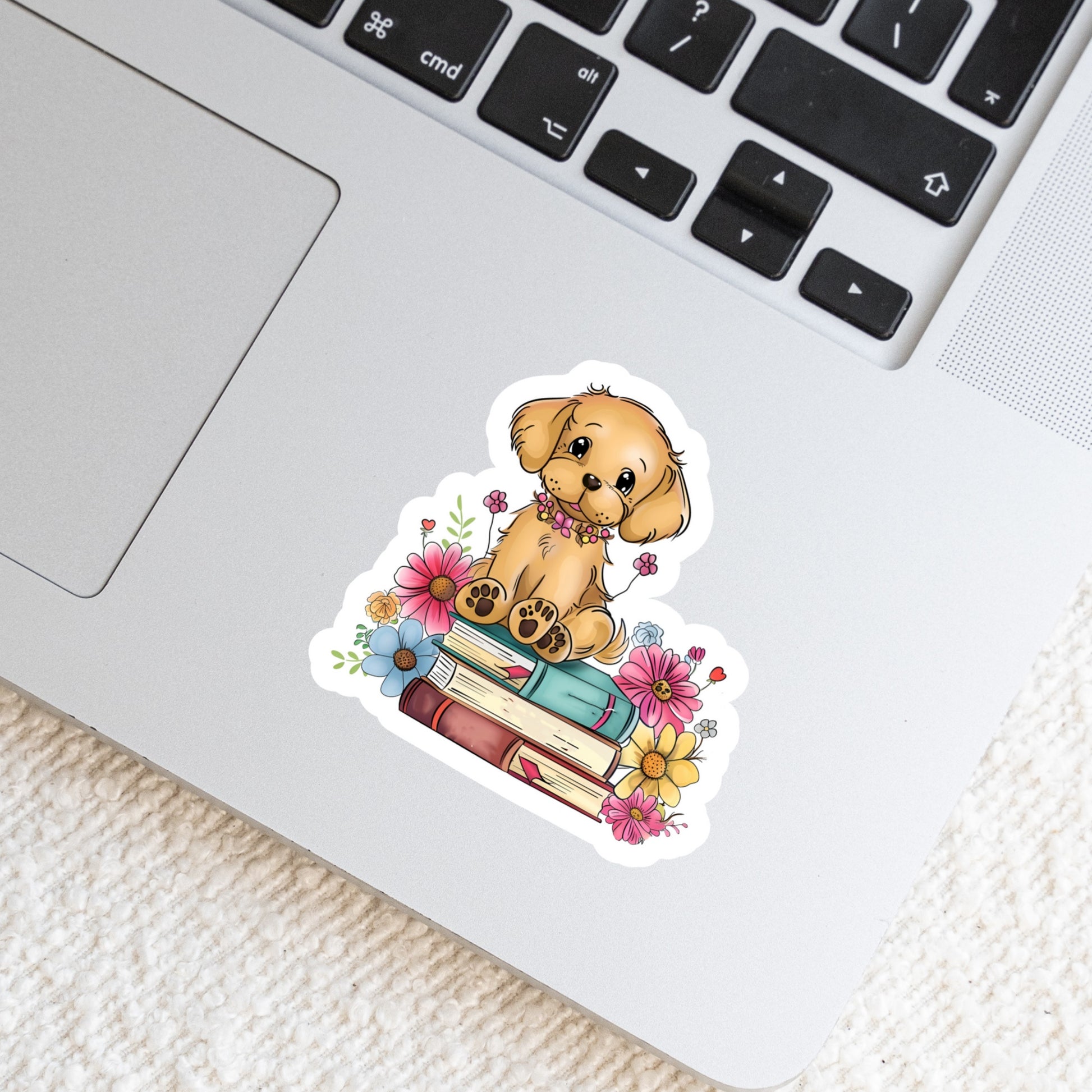 Puppy Dog with Books Book Reader Sticker โ 3" Waterproof Bookish Sticker with Holo Overlay โ Reading, Books, Reader Gift, Book Lover, Bookstore Merch