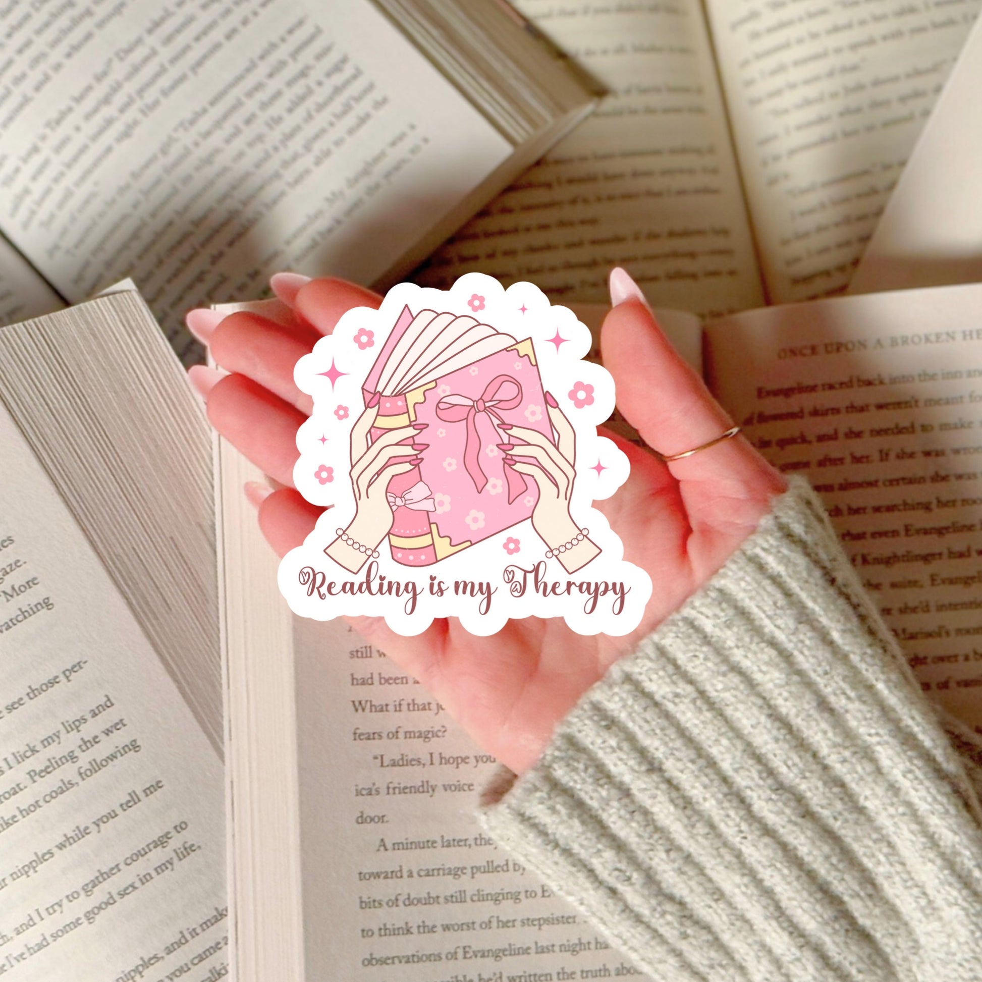 Reading is My Therapy Pink Coquette Girlie โ 3" Waterproof Bookish Sticker with Holo Overlay โ Reading, Books, Reader Gift, Book Lover