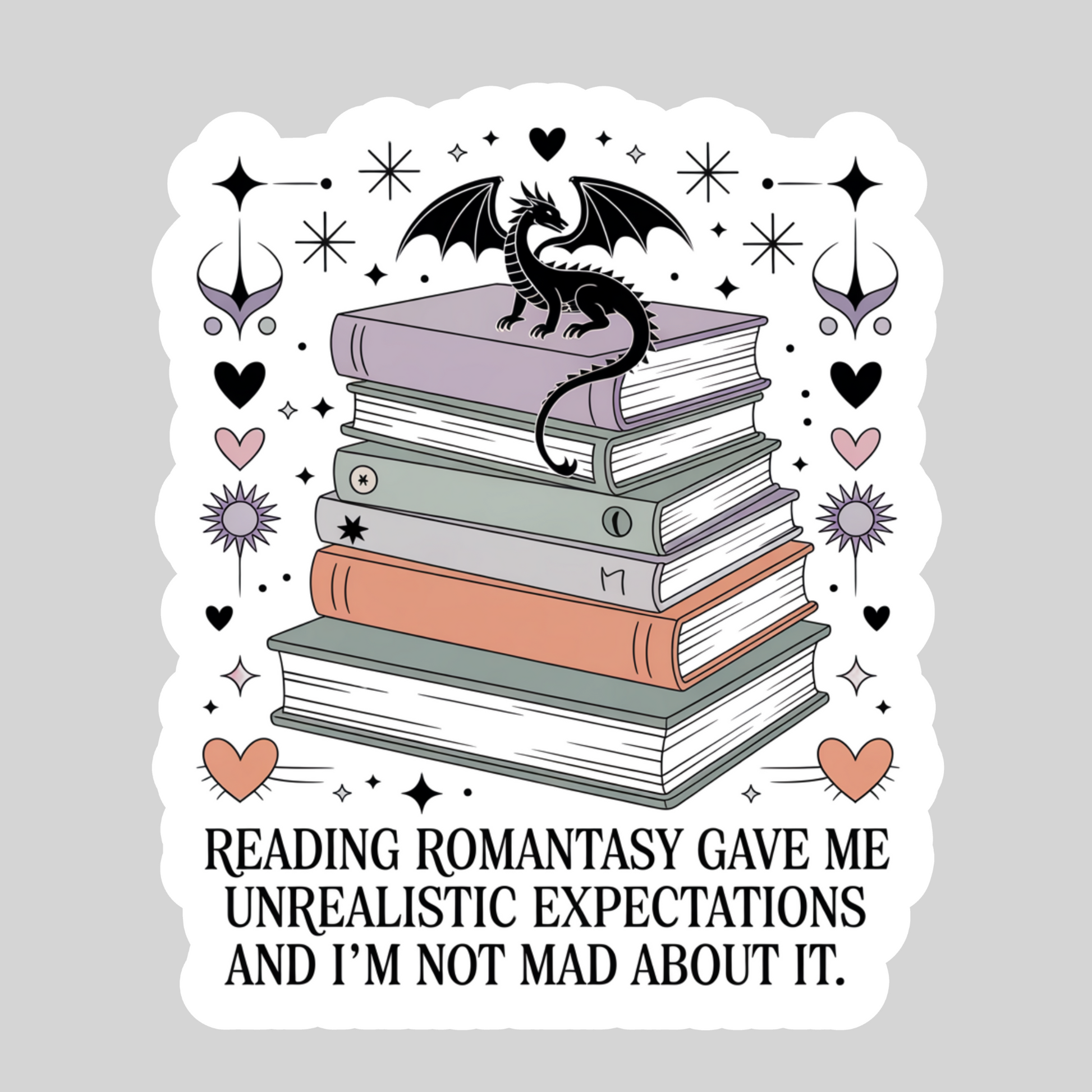 Reading Romantasy Gave Me Unrealistic Expectations and I'm Not Mad About It – 3" Waterproof Bookish Sticker with Holo Overlay – Reading, Books, Reader Gift, Book Lover